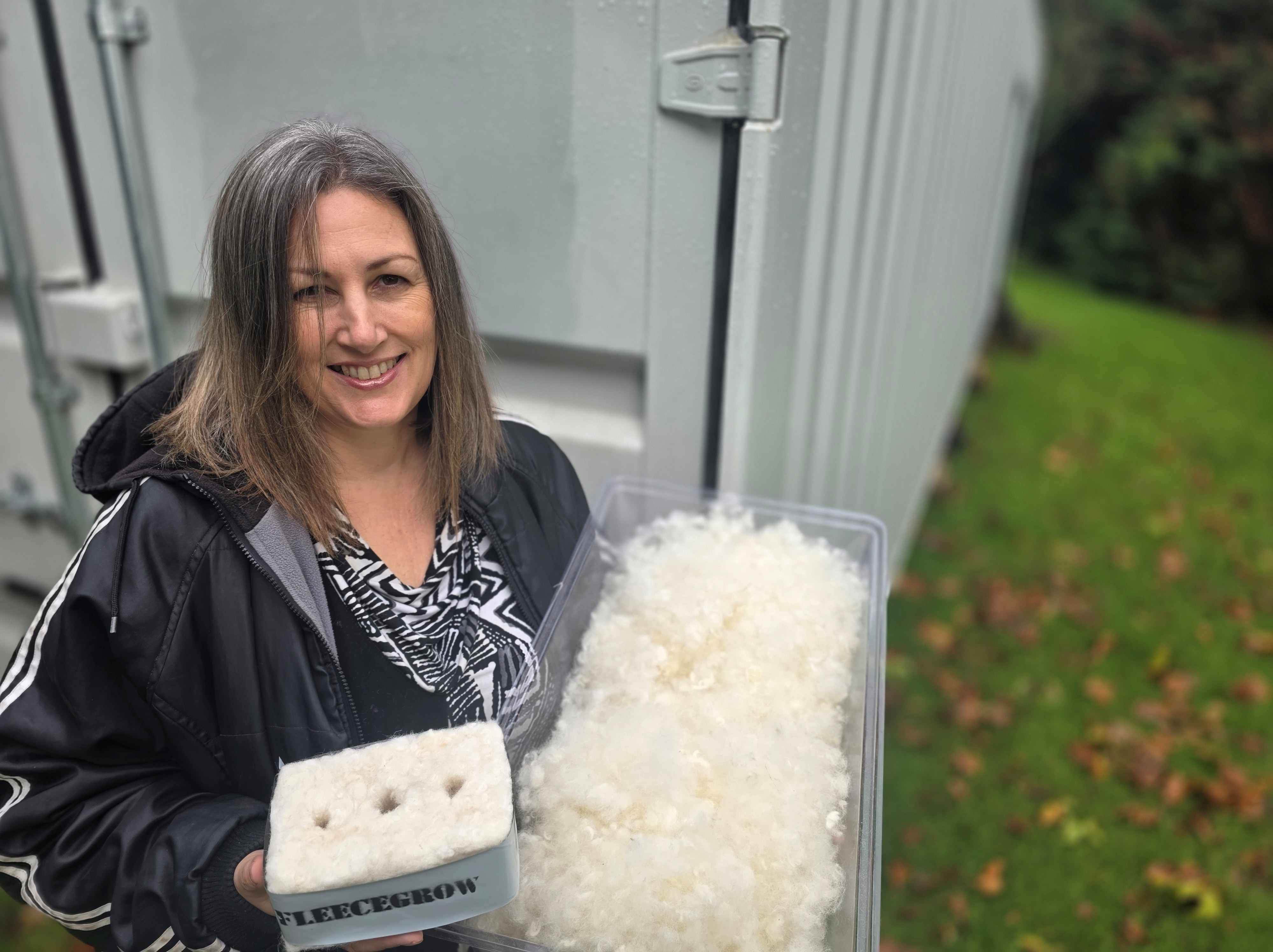 Last week a shipping container arrived, a critical piece of kit so they can proceed to proof of concept for the wool-based growing-media block. The container will house the prototype machines, and FleeceGrow has two year’s free use of the 40 foot shipping container for lease, courtesy of Whanganui’s Nick Walker and the team from Container Space NZ.