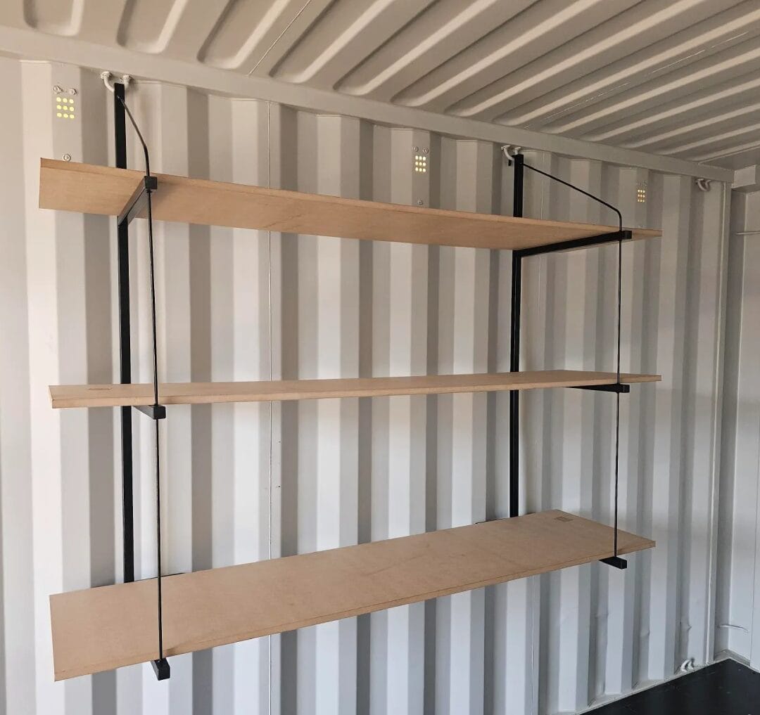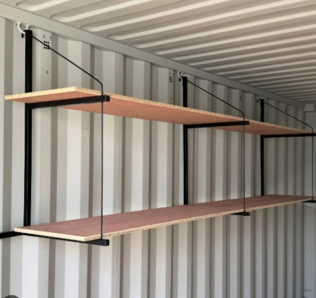 Looking to effectively store your goods whilst maximising the space? – hanging shelf brackets allow you to keep the floor area of your container free to store large heavy items against the wall, with shelving hanging above. Very flexible, we recommend 2 brackets for a minimum of 2.4m of shelving. Available in a variety from 3 tier to 4 tier, pipe rackiing or a work bench combo.